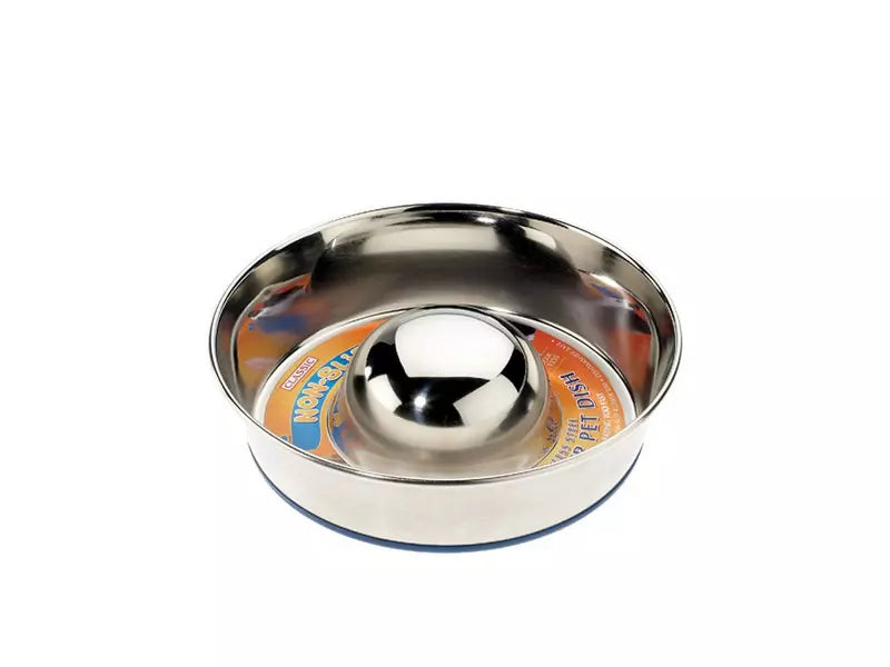 This durable stainless steel bowl is designed with a bump in the centre to slow down gulping dogs and a fused on non-slip rubber rim.