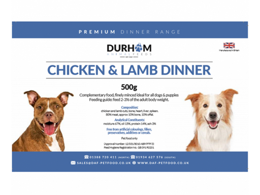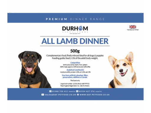 500g  INGREDIENTS 60% BONELESS BRITISH LAMB MEAT30% BRITISH DUCK CARCASS10% BRITISH LAMB OFFAL (LIVER/KIDNEY) NUTRITIONAL ANALYSIS MOISTURE 62.3% /...