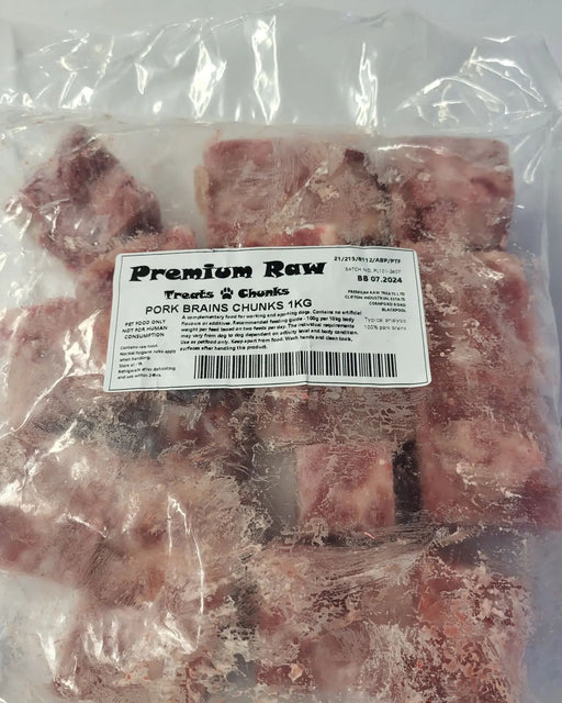 1kg 100% pork brain to be fed as half of the 10% offal allowance. (ie. 5% of overall diet) Frozen into chunks for easy portioning