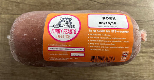 500g Brand new from Furry Feasts, a classic mix in a handy 500g chub for convenient portioning Pork meat, bone, heart & lung Protein 17, Moistu...
