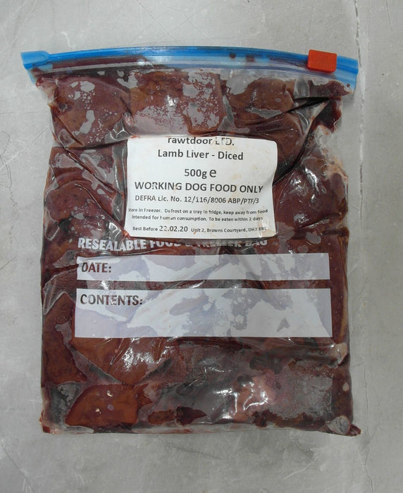 Hand-diced British lamb liver, flat packed in a resealable ziplock bag